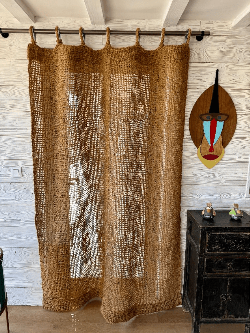 Rideau en fibres de coco naturelles. Tissage simple et dimensions personnalisables, à suspendre à la verticale en rideau coulissant, en passant une tringle ou un câble à travers les boucles en partie haute.